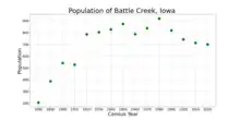 Battle Creek got its start in the year 1877, following construction of the Chicago and North Western Railway through that territory.[3] It was named after nearby Battle Creek.[4] The town was incorporated in 1880.[3] It is referenced in the 2011 film Butter as the birthplace of fictional character, Bob Pickler.
