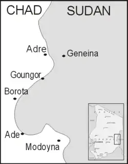 The Battle of Adré took place in Adré, Chad on 18 December 2005. The battle began when the Chadian rebel groups Rally for Democracy and Liberty (RDL) and Platform for Change, Unity, and Democracy (SCUD), allegedly backed by the government of Sudan, attacked the garrison in this city. However, Chadian loyalists, who had been forewarned by military intelligence of the attack, easily repulsed the attackers. Either seventy, one hundred, or three hundred rebels were killed, depending on reports. Governmental losses are unknown, but they lost at least one Russian-made helicopter in a collision with electric wires during the fighting, while another Mil Mi-17 helicopter was heavily damaged by rebel fire which killed at least one crew member.[1]