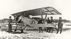 Two German imported DFW C.V reconnaissance planes were flown to Antrea in late March under the command of the Danish lieutenant Knud von Clauson-Kaas. The planes were not used in action as the Swedish pilots refused to fly in demanding conditions. On 10–11 April, six Russian pilots defected Soviet Russia and joined the Finnish Whites with a Grigorovich M-9 flying boat, two Nieuport 10 reconnaissance planes and two Nieuport 17 fighters. The pilots were supporters of the Russian White movement. From 13 April, the Russian pilots made reconnaissance flights, bombed the Red positions and dropped propaganda leaflets. The planes operated from the Antrea Airfield in the ice of lake Päähkjärvi. This is considered to be the beginning of the Finnish Air Force.[7]