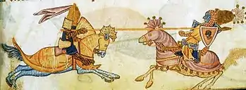 Just as the vanguard entered Arsuf in the middle of the afternoon, the Hospitaller crossbowmen to the rear were having to load and fire walking backwards. Inevitably they lost cohesion, and the enemy was quick to take advantage of this opportunity, moving into any gap wielding their swords and maces. For the Crusaders, the Battle of Arsuf had now entered a critical stage. Garnier de Nablus repeatedly pleaded with Richard to be allowed to attack. He was refused, the Master was ordered to maintain position and await the signal for a general assault, six clear trumpet blasts. Richard knew that the charge of his knights needed to be reserved until the Ayyubid army was fully committed, closely engaged, and the Saracens' horses had begun to tire.[36] Whether through a lack of discipline or acting on Richard’s delegated authority, the Order’s marshal and one of Richard’s household knights, Baldwin le Carron, moved through their own infantry and charged into the Saracen ranks with a cry of “St. George!”; they were then followed by the rest of the Hospitaller knights.[37][38][39] Moved by this example, the French knights of the corps immediately preceding the Hospitallers also charged.[40]