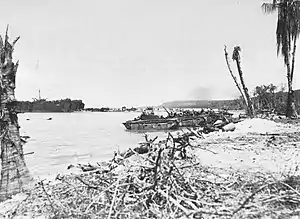The assault force consisted of five destroyer transports (APD), eight LSTs eight LCTs, and fifteen LCIs, supported by a myriad of smaller vessels including DUKWs, LCVPs and LVTs, which were chosen due to concerns about the coral reef opposite the landing beaches.[5] These were protected by two heavy cruisers, three light cruisers, and twenty-one destroyers;[6] several Australian vessels including the cruisers HMAS Australia and Shropshire and the destroyer Warramunga were included in this task force.[7][8] The naval forces, designated Task Group 77.2, were commanded by Rear Admiral William Morrow Fechteler. Close air support for the Allied operation was provided by Lieutenant General George C. Kenney's Fifth Air Force, operating from Hollandia and Wakde Island, although elements of the Thirteenth Air Force, as well as Australian and Dutch squadrons operating from as far away as Darwin, also provided strategic air support.[3][9]
