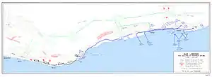 Allied engineers resumed their work on Mokmer airfield on 20 June.[33] The Americans broke through the Japanese defenses on 22 June, with the coastal strip from Bosnek to Sorido being captured, including the three airfields at Sorido (4500 ft), Borokoe (4500 ft) and Mokmer (8,000 ft). There were about 3,000 Japanese remnants trying to organize a final counterattack up to 17 August.[34]