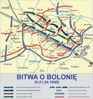 The offensive on Bologna started on 9 April at 4:00 am local time, with a major air and artillery bombardment of 400 guns firing on German positions, followed by an advance of ground forces the same evening.[1][10] Friendly fire caused casualties as American bombers killed 38 advancing Polish troops on that day.[11][12] The American and British units engaged the German flanks, while the Polish units broke through to the city.[1] On 10 April, Polish forces pushed the Germans away from the Senio River.[1] From 12–14 April Polish forces fought the Germans at the Santerno River and captured Imola.[1] From 15–16 April, the Poles fought at the Sillaro River and the Medicina Canal.[1] On 17 April, the commander of the Eighth Army ordered the Polish forces to continue their push towards Bologna from the east. The town was to be taken initially by the American troops of the Fifth Army advancing from the south.[1][13]