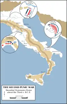 Shortly after the start of the Second Punic War, Hannibal crossed into Italy by traversing the Pyrenees and the Alps during the summer and early autumn of 218 BC.[4] He quickly won major victories over the Romans at Trebia and at Lake Trasimene.[5][6] After these losses, the Romans appointed Quintus Fabius Maximus Verrucosus as dictator to deal with the threat.[7][8] Fabius used attrition warfare against Hannibal, cutting off his supply lines and avoiding pitched battles. These tactics proved unpopular with the Romans who, as they recovered from the shock of Hannibal's victories, began to question the wisdom of the Fabian strategy, which had given the Carthaginian army a chance to regroup.[9] The majority of Romans were eager to see a quick conclusion to the war. It was feared that, if Hannibal continued plundering Italy unopposed, Rome's allies might defect to the Carthaginian side for self-preservation.[10]