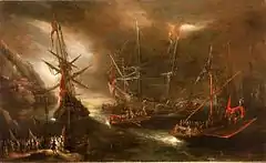 ![]() Battle between Spanish and Ottoman galleys. Oil on canvas attributed to Cornelis de Wael. | |||||||