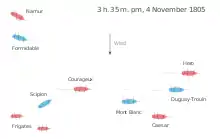 The battle began at 5.45 on the morning of 4 November, when Santa Margarita closed on the stern of the rear-most French ship, Scipion, and opened fire, being joined by Phoenix at 9.30.[7][8] At this stage the French were sailing roughly in line abreast, with Phoenix and Santa Margarita snapping at Scipion's heels.[7] Strachan was about six miles behind the French with Caesar, Hero and Courageux, accompanied by Aeolus, while Namur and Révolutionnaire were some way astern of them.[7] The British continued to overhaul the French, while Scipion exchanged fire with the harassing frigates from her stern-chasers. At 11.45 with an action now unavoidable Dumanoir ordered his ships to form line ahead on the starboard tack, as Strachan likewise lined his ships up and approached from windward on the French ships' starboard side.[7]