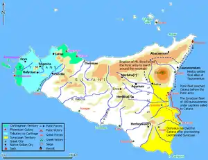 ![]() Punic Victory at Catana 397 BC. Political boundaries and path of troop movement are inexact because of lack of primary source data. Source map created by Marco Prins-Jona Lendering | |||||||
