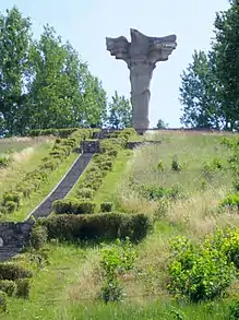 Several battle memorials were installed in the small town: walls were covered with mosaics depicting medieval battle scenarios, wooden statues of knights were placed in the town, the hotel was named "Piast" after the dynasty founded by Mieszko I.[6] A hill near the town was converted into the battle memorial "Victory at Cedynia", with a 15 metres (49 ft) tall concrete statue on the hilltop, showing a Polish eagle sitting on a sword rammed in the hill, the face turned west overseeing town and Oder river.[8] The mosaics on the hill's foot show white knights encircling and defeating black knights.[7] The monument was erected in 1972 to commemorate the 1000th anniversary of the battle, which was celebrated in the town by people from all regions of Poland, including high-ranking politicians, and accompanied by a large youth festival, "Cedynia 72".[5]