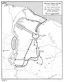 Air support during the fighting was provided to the Allied ground troops by Australian Beaufighters and Beauforts from No. 71 Wing RAAF and U.S. aircraft from the 110th Reconnaissance Squadron operating from Tadji and Saidor.[39][40] Naval gunfire support was provided by Task Force 74 (TF 74), comprising two Australian cruisers (Australia and Shropshire), two Australian destroyers (Arunta and Warramunga) and two U.S. destroyers (Ammen and Bache). Allied PT boats and destroyers also interdicted Japanese barge supply convoys between Aitape and Wewak and fired upon troop concentrations along coastal avenues of advance.[41] Due to the dense terrain, most supplies were airdropped to U.S. troops on the ground rather than being carried forward overland.[42]