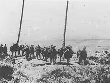 In spite of the successes of the destroyer runs, Kawaguchi insisted that as many soldiers of his brigade as possible be delivered to Guadalcanal by slow barges. Therefore, a convoy carrying 1,100 of Kawaguchi's troops and heavy equipment in 61 barges, mainly from the 2nd Battalion, 124th Infantry Regiment under the command of Colonel Akinosuka Oka, departed the northern coast of Santa Isabel Island on 2 September. On 4–5 September, aircraft from Henderson Field attacked the barge convoy, killing about 90 of the soldiers in the barges and destroying much of the unit's heavy equipment. Most of the remaining 1,000 troops were able to land near Kamimbo (9°15′32″S 159°40′18″E), west of the Lunga perimeter over the next few days.[18] By 7 September, Kawaguchi had 5,200 troops at Taivu Point and 1,000 west of the Lunga perimeter.[19] Kawaguchi was confident enough that he could defeat the Allied forces facing him that he declined an offer from the 17th Army for delivery of one more infantry battalion to augment his forces. Kawaguchi believed that there were only about 2,000 U.S. Marines on Guadalcanal.[20]
