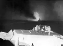 ![]() A Japanese aircraft crashes (upper center) into the ocean near the US cruiser Columbia on 2 November 1943, during air attacks on Allied ships off Bougainville, a few hours after the Naval Battle of Empress Augusta Bay. | |||||||