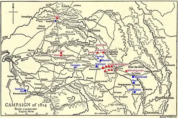 On 9–10 March 1814, Gebhard Leberecht von Blücher's 100,000-man Coalition army defeated Napoleon's 39,000-strong army in the Battle of Laon.[2] After drubbing the French on 9 March, Blücher became incapacitated by fever and an eye ailment, so command devolved upon his chief of staff August Neidhardt von Gneisenau. Though Gneisenau was a brilliant strategist, he was not capable of leading an army. The acting commander allowed his beaten foes to continue the fight the next day and then slip away that night without being pursued.[3] On 13 March, Napoleon fell on Emmanuel de Saint-Priest's Russian VIII Corps and a Prussian brigade in the Battle of Reims.[4] The Allied force was scattered with losses of 3,000 men and 23 guns, including Saint-Priest who was fatally wounded.[5]