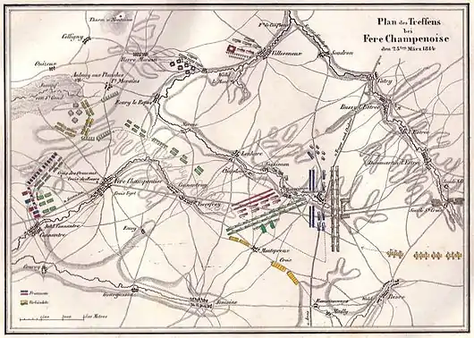 Marmont and Mortier spent the night after the battle at Allemant, to the northeast of Sézanne. Hearing that Yorck sent a force under Hans Ernst Karl, Graf von Zieten toward Sézanne, Compans abandoned the town at midnight and marched to join the two marshals at Allemant. Two hours later Marmont and Mortier began moving toward Sézanne.[42] The next morning they found Zieten in possession of the town, but their superior numbers persuaded the Prussian to withdraw after a skirmish that cost the French 200 casualties and their opponents 107.[43] Leading the Coalition pursuit, the Crown Prince of Württemberg entered Sézanne three hours after the French left. On 26 March, Compans with 1,000 men marched west through La Ferté-Gaucher and reached Coulommiers after some clashes with a Prussian brigade led by Heinrich Wilhelm von Horn. At Coulommiers where he spent the night, Compans was joined by Vincent's observation force and fugitives from the battle, raising his force to 2,200 infantry and 250 cavalry.[49]