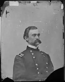 Grant ordered Major General Edward Ord to move part of the Army of the James from the lines near Richmond to fill in the line to be vacated by the II Corps under Major General Andrew A. Humphreys at the southwest end of the Petersburg line before that corps moved to the west. This freed two corps of Major General George Meade's Army of the Potomac for offensive action against Lee's flank and railroad supply lines: Major General Andrew A. Humphrey's II Corps and the V Corps commanded by Major General Gouverneur K. Warren.[30][31] Grant ordered the two infantry corps, along with Major General Philip Sheridan's cavalry corps, still designated the Army of the Shenandoah, under Sheridan's command, to move west. Sheridan's cavalry consisted of two divisions commanded by Brigadier General Thomas Devin and Brigadier General (Brevet Major General) George Armstrong Custer but under the overall command of Brigadier General (Brevet Major General) Wesley Merritt, as an unofficial corps commander, and the division of Major General George Crook detached from the Army of the Potomac. Grant's objectives remained the same although he thought it unlikely the Confederates would be drawn into open battle.[30][32]