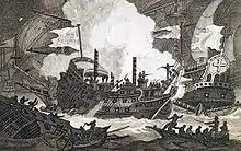Meanwhile, Defiance, Howard's flagship, received heavy gunfire from Aramburu's San Cristóbal before withdrawing from the battle. Revenge was left behind and directly engaged by Claudio de Viamonte's San Felipe. Viamonte boarded the English galleon, suffering the misfortune of the grappling hook parting after having only passed 10 men aboard her.[2] Shortly after Martín de Bertendona's San Bernabé did the same, this time successfully, and managed to rescue seven survivors of San Felipe's boarding party. San Bernabé's grappling was decisive to the fate of Revenge, because the English warship lost the advantage of her long-range naval guns. Conversely, the heavy musketry fire of the Spanish infantry forced the English gunners to abandon their post in order to repulse the attack.[7]