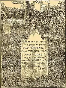Of the 11,000 men Washington led into battle, 30 officers and 122 men were killed, and 117 officers and 404 men were wounded.[23] According to a Hessian staff officer, some 438 had been taken prisoner by the British, including Colonel George Mathews and the entire 9th Virginia Regiment.[23][24] Brigadier General Francis Nash, whose North Carolina brigade covered the American retreat, had his left leg taken off by a cannonball, and died on October 8 at the home of Adam Gotwals. His body was interred with military honors on October 9 at the Mennonite Meetinghouse in Towamencin.[25] Major John White, who was shot at Cliveden, died on October 10.[26] Lieutenant-Colonel William Smith, who was wounded carrying the flag of truce to Cliveden, also died from his wounds.[26] In total, 57 Americans, over one-third of all those killed in the battle, died in the attack on Cliveden.[27]