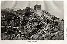 Ghazi Muhammad had built three walls across the side canyon about 4 km southeast of Gimry. Near the outer wall were two stone houses, to which the Russians paid little attention. Today these are marked by a modern reconstruction called Shamil’s Tower. Velyaminov’s plan was to take the left end of the first wall and then make a frontal attack while the wall was enfiladed. This failed because the officer turned too soon and made a frontal attack with great loss. At this point Gamzat-bek appeared from the south and threatened to cut off the head of the Russian force. Klugenau appeared at the right moment and Gamzat-bek withdrew, leaving Ghazi Muhammad to his fate. Seeing that the first attack had failed due to a mistake, Velyaminov tried the same tactic again. This time it worked. When the first wall was taken the Russians pursued so quickly that the enemy had no time to re-form on the second or third walls. By this time it was dark and the Russians camped where they stood.