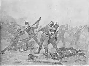 The remaining Swedish forces held the center, along the Hörnån, defending the two bridges going over the river—expect for the Savolax 1st battalion, which was positioned furthest to the right at the river mouth (not engaged), and half of the Jämtland 2nd battalion, which was kept in reserve. At half past ten, after more than two hours of intense fighting, Sandels ordered a retreat after having received a false report claiming that the Russians had encircled his left flank, towards Ängersjö.[2] The Savolax 2nd Battalion under Joachim Zachris Duncker acted as rearguard and covered the Swedish withdrawal; Duncker was mortally wounded under the fierce Russian pressure and his battalion dissolved with significant losses.[3]