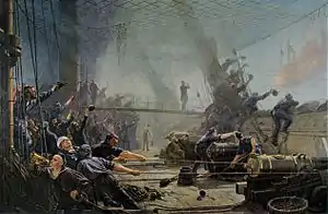 By 16:00, Schwarzenberg began to withdraw from the action, her forward rigging and forecastle burning badly. Tegetthoff decided to break off the engagement and fled to the neutral waters around Heligoland. As Tegetthoff's ships began to withdraw, one of them scored a hit on Jylland's rudder, which prevented Suenson from being able to effectively pursue the retreating Austrians and Prussians.[11] McClintock took Aurora between the two squadrons to deter Suenson from pursuing Tegetthoff in violation of British neutrality.[12] The two Austrian frigates had suffered a total of 36 men killed and 108 wounded; of those 31 killed and 81 wounded aboard Schwarzenberg—and both vessels were damaged. The Danish vessels suffered 14 men killed and 54 wounded, and only Niels Juel was damaged in the action.[13][14] The battle was the last to be fought solely by wooden warships, and it was also the last major naval action to involve the Danish Navy.[12]