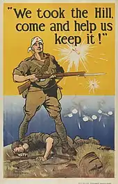 The assault resumed on 27 August and further progress was made up the slope, but the summit of the hill was still held by the Ottomans.[14] On the evening of 27 August 1915, the 9th Light Horse Regiment, of the Australian 3rd Light Horse Brigade, were sent in as reinforcements. One wave of 75 men led by the new commander, Lieutenant Colonel Carew Reynell, lost its way and was caught in the open by Ottoman machine guns, with many soldiers and Reynell being killed.[15] The 10th Light Horse Regiment was committed to the fighting,[16] and on 28 August, some trenches at the summit were captured but the Ottomans clung to the vital northern face which overlooked Suvla. Attacking and counter-attacking continued until this final assault on Hill 60 ended on 29 August 1915.[17]