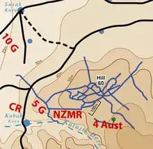 The initial plan allocated the primary objective of Hill 60 to the New Zealand Mounted Rifles (NZMR). To their left, the Connaught Rangers were to take the water wells at Kabak Kuyu and the Gurkhas the wells at Susak Kuyu. To the right of the NZMR, troops of the Australian 4th Infantry Brigade (4 Aust) supported by the 10th Hampshires were to launch a feint attack, on the spur just above the knoll itself, to draw off Turkish reserves.[7][8]