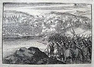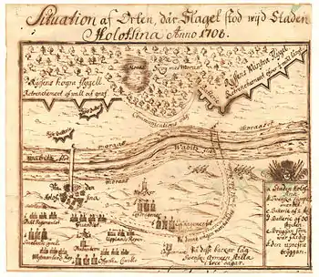 The Battle of Holowczyn or Holofzin or Golovchin was fought in July 1708 between the Russian army, and the Swedish army, led by Charles XII of Sweden, only 26 years of age at the time. Despite difficult natural obstacles and superior enemy artillery, the Swedes were able to achieve surprise and defeat the numerically superior Russian forces, who were separated from each other, had no overall command and could not coordinate their actions,[6] so that only 8,000-9,000 of them could take part in the fighting.[3][2] Reportedly, it was Charles' favourite victory.[7]