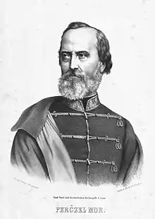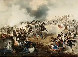 During the cannonade Perczel tried a flanking maneuver, ordering to his infantry and cavalry to encircle Ottinger's right wing.[8] Seing this, Ottinger ordered to his cavalry to attack. While Ottinger, leading a cuirassier and a Dragoon regiment tried to distract the Hungarians attention from the front, Major General József Fejérváry attacked Perczel's troops left wing with 4 Cuirassier companies, 2 Lancer companies and a cavalry battery, while Captain Gideon Ritter von Zastavniković directed 5 Cuirassier companies and a half cavalry battery against the right wing.[8] The combined cavalry attack was devastating because it hit the Hungarians from side, right during their flanking march.[8] First the artillerymen, left without protection, started to rout towards Újvidék, followed by the cavalry, and when Ottinger's went on attack against the infantry, this too started to flee.[9] Only two companies of the 3. (Ferdinand) Hussar regiment tried to cover the fleeing soldiers, but they had no chance against the four times bigger enemy, even if all the five Hungarian Hussar companies would had fight to their deaths.[8] The Hungarian defeat could had been even greater, if Major General Franz Adam Freiherr Grammont von Linthal would had attacked too. Luckily for the Hungarians the brigade stationed in Káty, failed to participate in the battle, because when Grammont, on march towards the battlefield, when he heard the sound of the cannons, he retreated back to the village, fearing that he will be cut off the rest of the Austrian troops.[9]