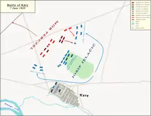 After these smaller victories against Perczel's attacks, Jelačić decided to go on offensive, so he ordered to his troops to advance from the Titel plateau to Bácska.[6] On 6 July Perczel received the report that Jelačić's troops occupied Káty, Kovilszentiván, Gyurgyevó and Zsablya, and ordered immediately to his troops, stationed at Újvidék, to march there in three columns.[7] The Hungarian troops started their march in the night from 6 to 7 July. The first column, led by Colonel László Gál, marched on the Újvidék-Káty road, the brigade led by Perczel himself went towards the Káty woods, with the cavalry brigade designed to be the reserve, while the brigade led by Major Antal Czintula marched from Csúrog to Zsablya, hoping to attack Jelačić's right wing and rearguard.[8]