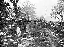 Shōji's unit was based on a core of the 230th Regiment of the 38th Division, with supporting units numbering roughly 3,000 men in total.[12] The detachment was further subdivided into two "assault groups" and a covering group, with one of the assault groups (numbering around 1,200 men) under one Major Shichiro Wakamatsu being tasked with capturing the Kalijati Airfield.[5] The Kalijati airfield itself, 75 km (47 mi) distance from Eretan Wetan, was initially defended by a single KNIL company of 180 men under Lt. Col. J.J. Zomer, and was later replaced by 170 British personnel (including Army and RAF units) which arrived at night on 28 February as the KNIL soldiers instead took up defensive positions some distance away from the airfield itself, or held in reserve.[13] In total, including anti-air gunners already stationed at Kalidjati, there were 350 British troops there.[14] In the morning of 1 March, once the garrison was informed of the Japanese landings, the pilots of the RAF warplanes were ordered to move to Andir airfield in Bandung.[13]