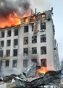 The Kharkiv Police headquarters, a military academy, and the National University of Kharkiv were damaged by Russian shelling during the morning.[58][59] Several residential areas were also struck by Russian missiles.[46] Russian missiles later struck Freedom Square again, damaging the Kharkiv City Council building and the Derzhprom, in addition to some high-rise buildings.[60]