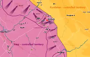 The Battle of Kirkuk (2017), part of the 2017 Iraqi–Kurdish conflict, was a military deployment by the Iraqi Security Forces to retake Kirkuk Governorate from the Peshmerga after the latter ignored repeated warnings to withdraw,[15] sparking clashes between the two forces.[16] The advance began on 15 October 2017, with the city of Kirkuk being retaken the following day.[4] The international coalition described the events as "coordinated movements, not attacks" with most of the Peshmerga withdrawing without fighting,[2][17] though between 37–117 were killed.[18][19][20]