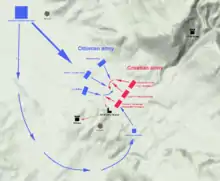 The 3,000 Ottoman cavalrymen located in the wooded area of the Krbava field crossed the Krbava River and attacked the Croatian rear. Then the main Ottoman forces of Hadım Yakup Pasha, also waiting hidden in the forests, commenced a frontal attack. Thus, the Croatian army was attacked from the front, right, and the rear.[18] The Croatian left flank of Bernardin Frankopan could not withstand the attacks of the Turkish light cavalry and began retreating. However, most of the Croatian infantry was surrounded and could not retreat. The Croatian army suffered a total defeat and only a small number of men managed to reach safety in the nearby fortified town of Udbina.[19]