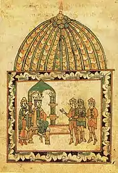 The Russian army was organized into six "regiments" - a Patrol, a Forward, two regiments of "Right" and "Left Hand," a Large regiment and an Ambush regiment. In turn, each of the regiments was divided into smaller tactical units - "banners" (a total of about 23).[36] On the field the army was arranged in multiple lines, and probably, the location of the regiments did not match their names (there is no evidence that the regiments of the Left and Right Hand disposed in line with the Large Regiment). The terrain did not allow for a broad front; probably, the units entered into battle gradually. The army's flanks were protected by ravines with dense thickets which excluded any chance for a surprise flank attack of a Horde. The Ambush regiment under the command of Vladimir the Bold and Dmitry Bobrok (brother-in-law of the Grand Prince) was hidden behind the line of Russian troops in an oak grove.[lower-alpha 1] The Grand Prince himself went to the front lines, leaving his trusted boyar Mikhail Brenok as the head of the Large Regiment under the great banner. He also exchanged with the boyar horses and gave him a coat and a helmet, so the Grand Prince could fight like an ordinary boyar, remaining unrecognized.[lower-alpha 2] The battle opened with a single combat between two champions.[lower-alpha 3] The Russian champion was Alexander Peresvet and The Horde's champion was Temir-murza (also Chelubey or Cheli-bey, also Tovrul or Chrysotovrul). During the first pass of the contest each champion killed the other with his spear and both fell to the ground. Thus, it remained unclear whose victory was predicted by the outcome of the duel.[37]
