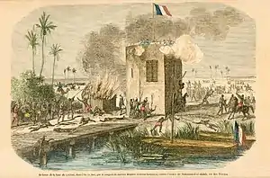 Trarza warriors soon swarmed up the area around the fortified building. A small shack beside the tower which served as kitchen for the garrison was set on fire by the Trarza, and a civilian woman who had hidden inside perished in the flames.[21] The attackers furiously assailed the fortification. Some attempted to fire into the small loopholes with their rifles while some others unsuccessfully tried to damage the tower's structure with their swords and daggers.[21] Despite the thick smoke emanating from the burning shack and the terrified screams of the civilians on the lower floor, the fourteen French marines kept their composure and methodically fired at their numerous enemies without wasting ammunition.[5][21] The defenders were resolute to fight to the very end and agreed with each other's that they would blow up the whole building by igniting the powder reserve if the attackers somehow managed to break in or climb up the tower.[21][3]