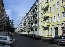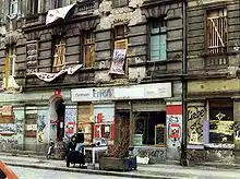 Soon there were about 250 squatters living on the street.[3] House number 4 was occupied by gays and queers.[2] Number 5 hosted an infoshop, number 6 was a pub and there was a community cafe at 7 and 9.[4] The squatters were mainly from West Berlin and connected to the left-wing autonomous movement.[3] In this time frame, there were over 130 squatted buildings in East Berlin.[5]