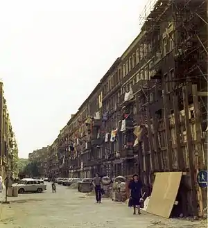 In the 1980s, the run-down buildings on Mainzer Straße in Friedrichshain were scheduled for demolition and by 1989 the residents had been decanted. However, the fall of the Berlin Wall in November 1989 put the demolition plans on hold.[1] The apartments at 2–11 Mainzer Straße were squatted in May 1990.[2]
