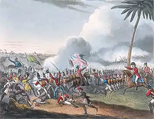 A few Mysorean horsemen broke through the regiment, but were instantly shot in its rear. The British artillery arrived and opened fire. The enemy cavalry fell back; at the same time, the line advanced, and decided the fate of the day on that part of the battlefield; a distant cannonade, however, indicated that the fighting was raging elsewhere.[4]