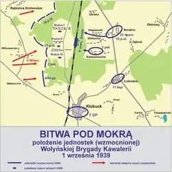 The Wołyńska Cavalry Brigade was located north of the town of Kłobuck, along the railway to Katowice. Two regiments (19th Volhynian Uhlan Regiment and 21st Vistula Uhlan Regiment, as well as 4th battalion of the 84th Infantry Regiment) were entrenched on both ends of a forest surrounding the village of Mokra, to the west of the north-south rail road line. To the east, Colonel Julian Filipowicz placed the reserves of the brigade: 12th Podolian Uhlan Regiment, 2nd Mounted Rifles Regiment and 21st Armoured Battalion.