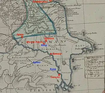 Osman Pasha rewarded the Tatars and arranged a three-day feast for them, but the reward seemed insufficient to Adil, or he simply did not mind robbing.[14] Adil Giray and the appointed Aresha Piyale-bey by the sanjakbey decided to attack the camp of Aras Khan.[2] Having learned from the survivors of the battle and fled Qizilbashs that the horde of Tatars headed towards the camp, Hamza Mirza ordered the emirs to hurry towards the camp, guard it and organize patrols along the river. The Talysh emirs guarded the bridge in Javad (influenced by Aras and Kura) for the passage of Qizilbash soldiers retreating from Shamakhi. While patrolling the banks of the river, they received news of the Adil Giray's approach. The emirs immediately blocked the bridge, but the Tatar cavalry rushed into the water, swam across the river and got into a fight.[10]