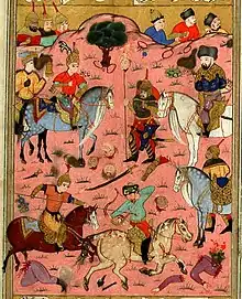 The battle for Shamakhi began on 9 November 1578 and lasted for several days.[8][11] On the morning of the third day, the brother of the Crimean Khan, Adil Giray, at the head of 15 thousand Tatar horsemen, came to the aid of the Ottomans, this decided the outcome of the battle and the Safavids were defeated.[2][12][13] Aras Khan and his son were taken prisoners by the mirakhur Adil Giray and were executed.[5][10][14] The losses on both sides were enormous.[9][15]