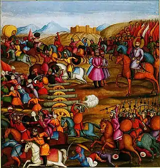 ![]() Painting of the battle illustrating the initial phases, with Nader leading his armies on horseback. | |||||||||