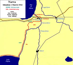 Launching the Kingisepp–Gdov Offensive on 1 February, the Soviet 2nd Shock Army's 109th Rifle Corps captured the town of Kingisepp on the first day.[16] The German 18th Army was forced into new positions on the eastern bank of the Narva River.[1] Forward units of the 2nd Shock Army crossed the river and established several bridgeheads on the west bank to the north and south of the city of Narva on 2 February. The 2nd Shock Army expanded the bridgehead in the Krivasoo Swamp south of Narva five days later, temporarily cutting the Narva–Tallinn Railway behind the III SS Panzer Corps. Govorov was unable to encircle the smaller German Army Group, which called in reinforcements. These came mostly from the newly mobilised Estonians, motivated to resist the looming Soviet return. At the same time, the Soviet 108th Rifle Corps landed units across Lake Peipus 120 kilometres south of Narva and established a bridgehead around the village of Meerapalu. By a coincidence, the I.Battalion, SS Volunteer Grenadier Regiment 45 (1st Estonian), which was headed for Narva, reached the same area. A battalion of the 44th Infantry Regiment (consisting of personnel from East Prussia), the I.Battalion, 1st Estonian and an air squadron destroyed the Soviet bridgehead on 15–16 February. The Mereküla Landing Operation was conducted as the 517-strong 260th Independent Naval Infantry Brigade landed at the coastal borough of Mereküla behind the Sponheimer Group lines. However, the unit was almost completely destroyed.[1][10]
