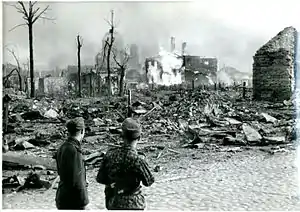 The Soviet air force conducted an air raid, leveling the historic town of Narva on 6 March. An air and artillery shock of 100,000 shells and grenades at the "Nordland" and "Nederland" detachments in Ivangorod prepared the way for the 30th Guards Rifle Division's attack on 8 March. Simultaneous pitched battles took place north of the town, where the 14th Rifle Corps supported by the artillery of the 8th Estonian Rifle Corps attempted to re-establish a bridgehead. Regiments of the Estonian SS Division repulsed the attacks, causing great Soviet losses.[1][10]