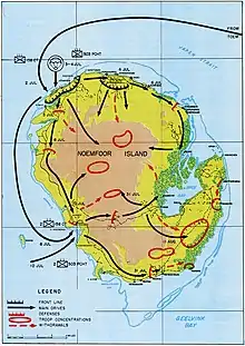 By 20 June, Japanese forces on Biak had been largely defeated and construction work began on the Mokmer airfield, which was operational two days later.[12] Bombing of the Noemfoor by the United States Army Air Forces (USAAF) and Royal Australian Air Force (RAAF) began as early as April 1944.[13] Between 20 June and 1 July, Allied bombers dropped 800 tons of bombs on the island.[14]