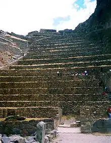 The actual location of the battle is the subject of some controversy. According to Canadian explorer John Hemming, Spanish forces occupied a plain between Ollantaytambo and the Urubamba River while the main Inca army was located on a citadel (the Temple Hill) overlooking the town, protected by seventeen terraces.[30] However, Swiss architect Jean-Pierre Protzen argues that the topography of the town and its surrounding area does not match contemporary descriptions of the battle. An anonymous account attributed to Diego de Silva claims that the Inca army occupied a set of eleven terraces, not seventeen; while the chronicle of Pedro Pizarro describes a gate flanked by walls as the only way through the terraces. Protzen thinks that these descriptions allude to a set of eleven terraces that close the plain of Mascabamba, near Ollantaytambo, which include the heavily fortified gate of T'iyupunku. At this location, when the Spaniards faced the terraces they would have had the Urubamba River to their left and the steep hill of Cerro Pinkuylluna to their right, matching the three sides from which they were attacked during the battle. If Protzen's hypothesis is correct, the river diverted to flood the battlefield was the Urubamba, and not its smaller affluent, the Patakancha, which runs alongside the town of Ollantaytambo.[31]