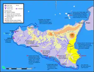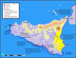 In response, Lilybaeum was blockaded by a Roman fleet commanded by the year's consuls Publius Claudius Pulcher and Lucius Junius Pullus. Pulcher arrived in Sicily first with part of the fleet and took charge of the operations, while Junius stayed back in Italy to organize supplies and ready the remainder of the fleet. Carthage managed to resupply Lilybaeum through the exploits of a small squadron led by a commander named Hannibal, son of Hamilcar, who managed to break the siege in broad daylight and deliver supplies to the garrison of Lilybaeum. Hannibal left the city carrying the useless cavalry horses and sailed to the harbour of Drepana at night, before the Romans knew what was happening and could respond.[2] This supply operation was repeated several times, which negated the whole effect of the blockade, since the Punic garrison was being fed and kept in contact with Carthage.[3]