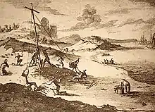 Almeida allowed his captains Pedro and Jorge Barreto to return to the village on the morning of 1 March 1510 with a force of around 150 men armed with swords, crossbows and spears and raided the village. The South African military historian Willem Steenkamp speculates that the ǃUriǁʼaekua allowed the Portuguese to advance inland so as to be able to engage with them at close quarters when they entered the heavily bushed areas more inland.[1] The Portuguese reached the village which they found deserted except for a few children and cattle,[1] which the Portuguese started abducting and stealing.[5][6][7]