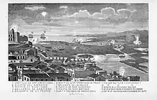 On 21 April, the British started a 7-day artillery duel with the Spanish forts of San Gerónimo and San Antonio, located at the Boquerón Inlet. At the same time, further Spanish forces put pressure on the British positions, the Spanish recaptured Martín Peña Bridge, while militia led by Sergeant Francisco Díaz raided behind British lines, bringing back prisoners. Then, on the 29th and 30th, the Spanish crossed the Boquerón Inlet, and forced the British to pull back.[2][3]
