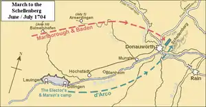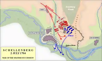 The Battle of Schellenberg, also known as the Battle of Donauwörth, was fought on 2 July 1704[lower-alpha 1] during the War of the Spanish Succession. The engagement was part of the Duke of Marlborough's campaign to save the Habsburg capital of Vienna from a threatened advance by King Louis XIV's Franco-Bavarian forces ranged in southern Germany. Marlborough had commenced his 250-mile (400 km) march from Bedburg, near Cologne, on 19 May; within five weeks he had linked his forces with those of the Margrave of Baden, before continuing on to the river Danube. Once in southern Germany, the Allies' task was to induce Max Emanuel, the Elector of Bavaria, to abandon his allegiance to Louis XIV and rejoin the Grand Alliance; but to force the issue, the Allies first needed to secure a fortified bridgehead and magazine on the Danube, through which their supplies could cross to the south of the river into the heart of the Elector's lands. For this purpose, Marlborough selected the town of Donauwörth.