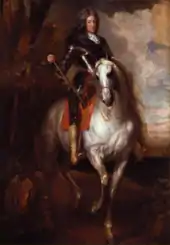 The second assault proved no more successful. The red-coated English and the blue-coated Dutch advanced side by side in perfect order for a second attempt. Requiring from them another concerted effort their general officers personally led the men from the front into a second torrent of musket-shot and grenades.[27] Again the Allies left many dead and wounded at the enemy palisade including Marshal Count von Limburg Styrum who had led the second assault. With broken ranks, and in confusion, the attacking troops fell once more back down the hill. With the Allies repulsed for a second time the exultant Bavarian grenadiers, with bayonets fixed, poured over their breastworks to pursue the attackers and drive them to defeat.[28] But English guardsmen, aided by Lumley's dismounted cavalrymen, prevented a total rout, compelling the Bavarians back behind their defences.[29]
